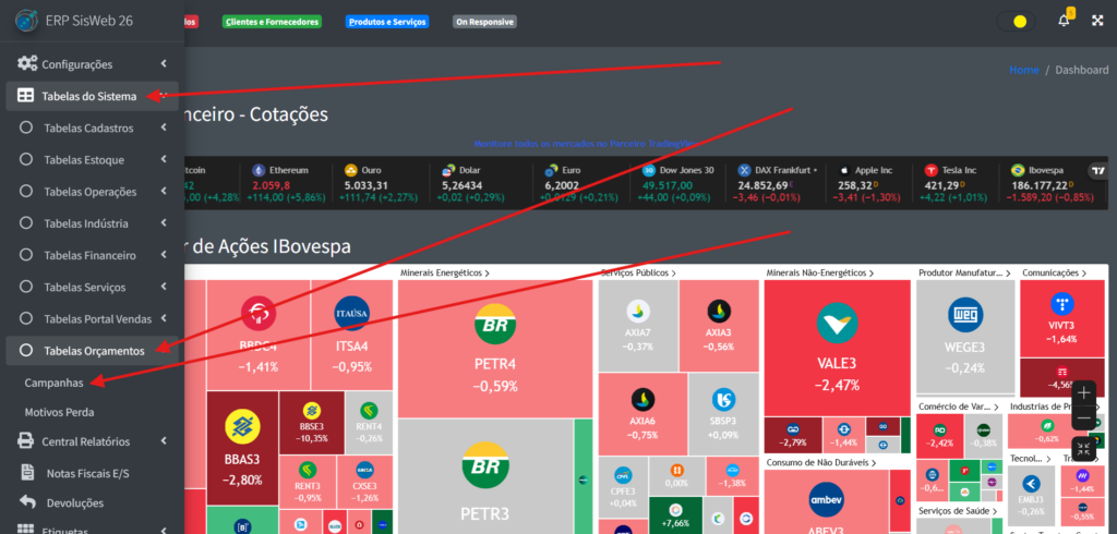 Para poder acessar a parte de Campanha, na aba lateral do site, clique em “Tabelas de Sistema” -> “Tabelas Orçamentos” -> “Campanha“.
