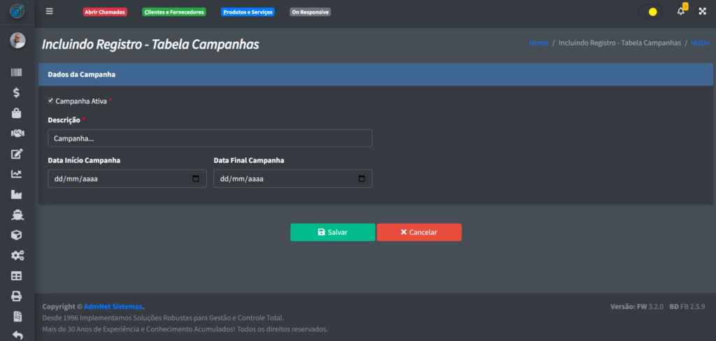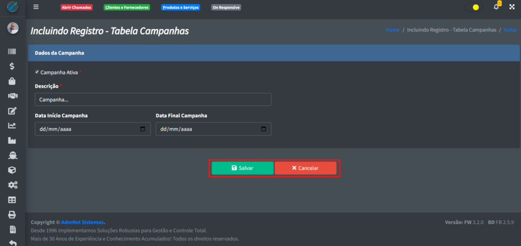 Após clicar em “+ Incluir“, você verá uma tela onde poderá cadastrar a sua campanha: