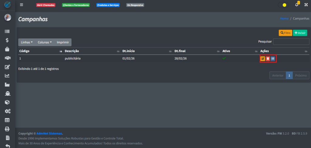Para pode incluir uma nova campanha, clique no botão “+ Incluir“: