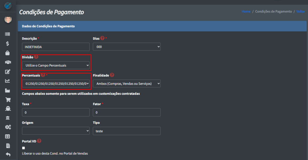 Agora, caso você precise fazer um parcelamento com prestações variáveis, deixe o campo “Divisão” com o valor Utilize o campo percentuais e preencha o campo “Percentuais” (Verifique a documentação sobre a tabela de pagamentos percentuais para entender a como colocar um novo percentual no sistema).