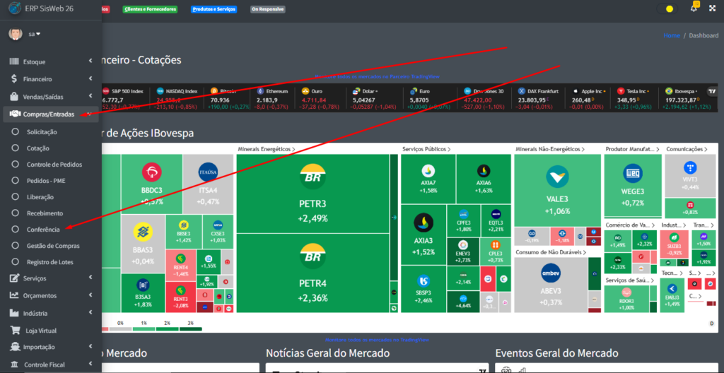 Para poder verificar a conferência de pedidos das compras, vá na aba lateral do sistema e clique em “Compras/Entradas” -> “Conferência”.