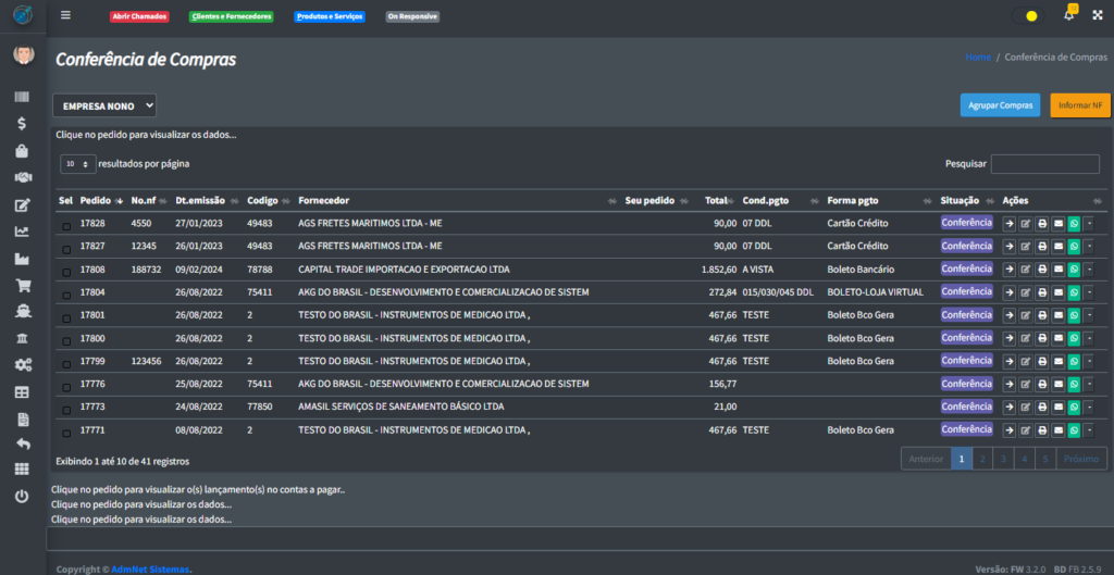 Na tela de conferências, você encontrará uma lista de pedidos de compra aguardando conferência.
