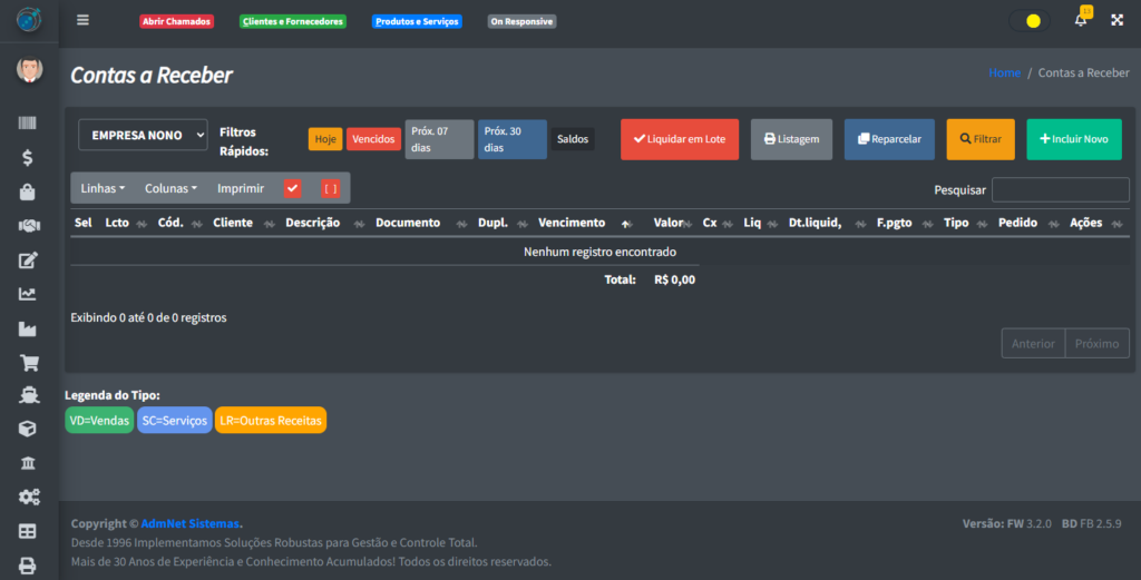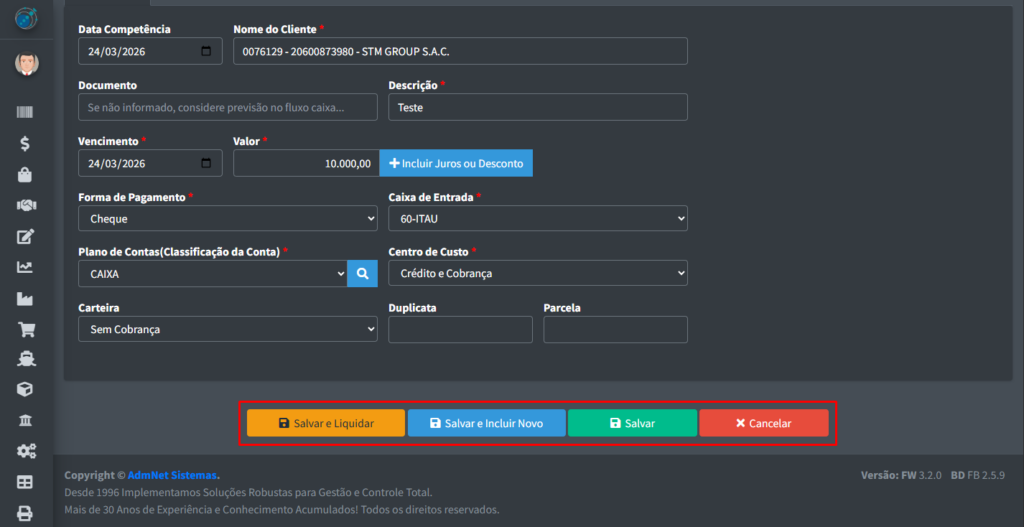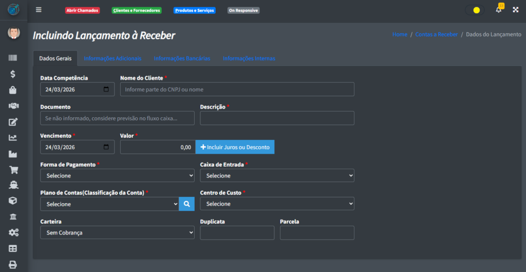 - Salvar e Incluir Novo: Salva o seu registro novo e limpa os campos para que possa ser adicionado um novo lançamento a receber;
