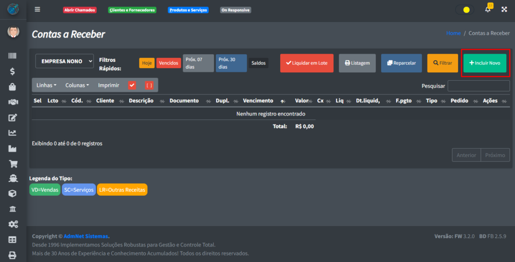 Para poder adicionar um novo lançamento a receber, clique no botão “+ Incluir Novo“