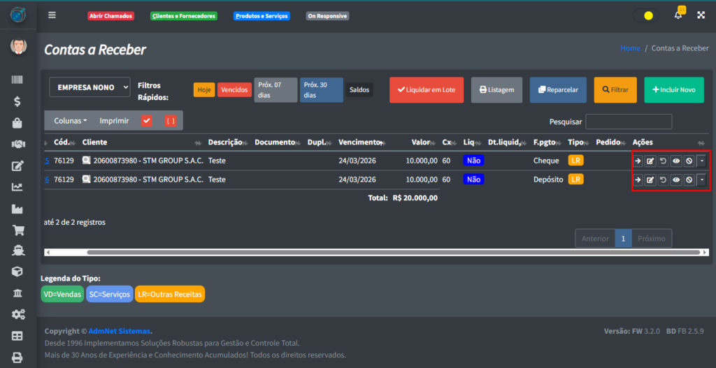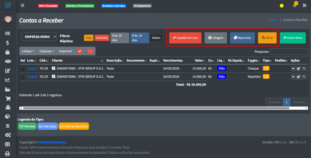 - Liquidar em Lote: Ao selecionar um ou mais registros na tabela, abre uma tela onde você pode liquidar todos de uma vez;