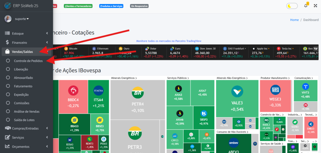 Para acessar a parte de “Controle de Pedidos“, vá para a aba lateral do sistema e clique em “Vendas/Saídas” -> “Controle de Pedidos“.