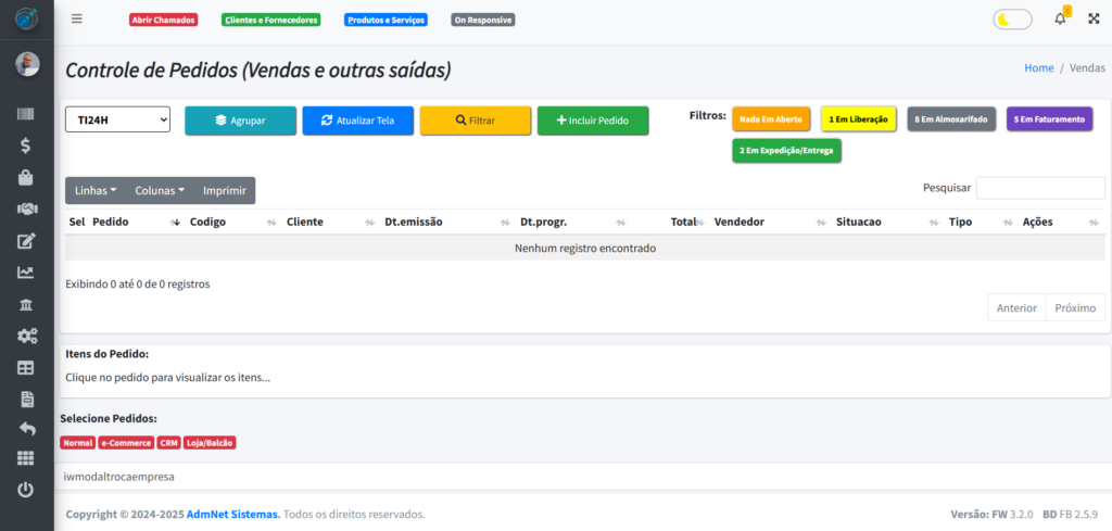 - Algumas informações precisam ser cadastradas anteriormente para que você consiga preencher o formulário do pedido por completo, como o campo cliente, item, etc. ↩︎