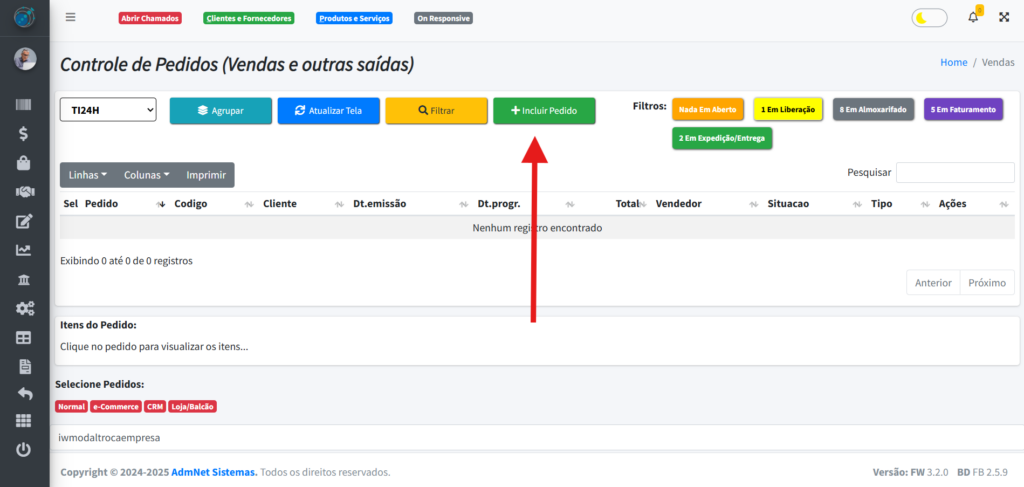 Para adicionar um novo pedido, clique no botão “+Incluir Pedido”.