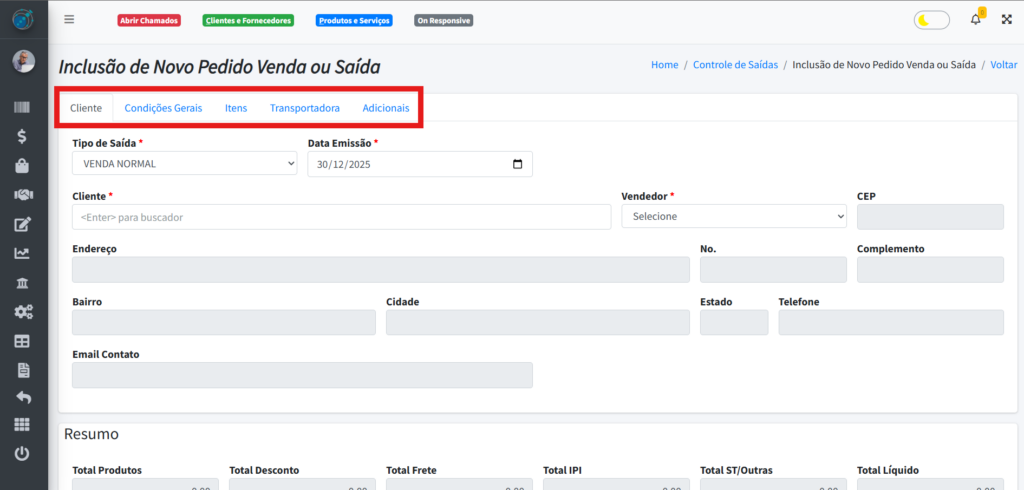 Ao clicar no botão “+Incluir Pedido”, aparecerá vários campos para você preencher, além de uma nova aba na parte superior do formulário.