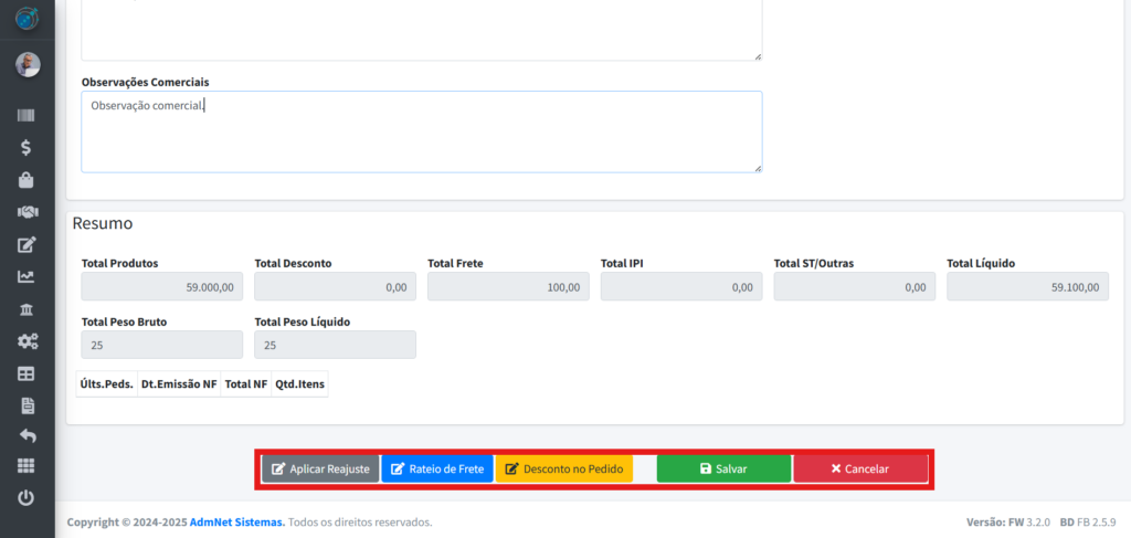 - Aplicar Reajuste: Faz um reajuste do preço do produto que foi colocado no pedido;