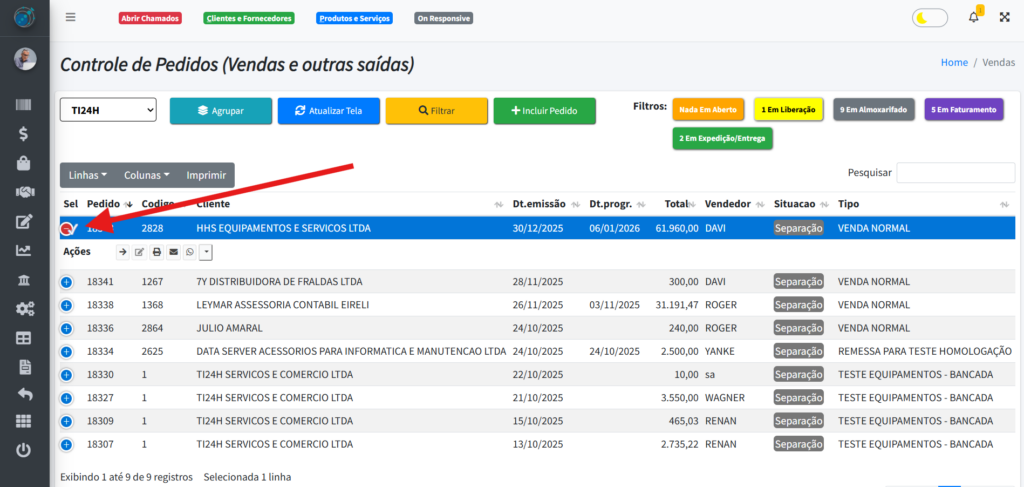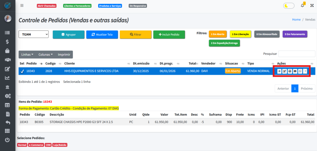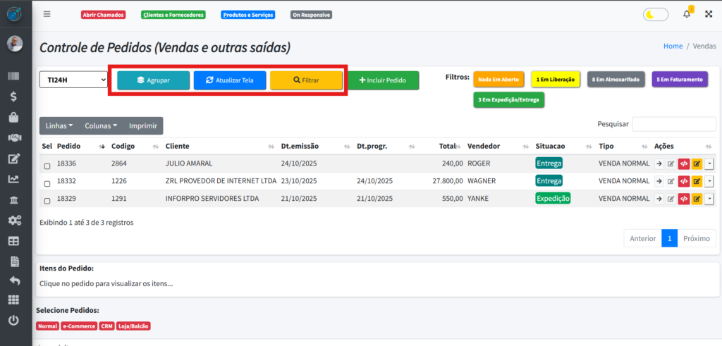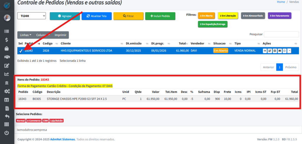 Ao clicar no botão do lado esquerdo do pedido, você conseguirá selecionar ele e verá algumas informações a mais na tabela “Itens do Pedido“: