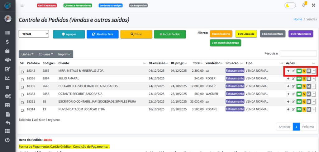 Após o pedido ficar na situação de faturamento, aparecerá alguns novos botões ao lado direito dele: