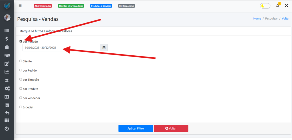Selecione algum filtro para os produtos e preencha com os dados necessários, caso haja algo a preencher.