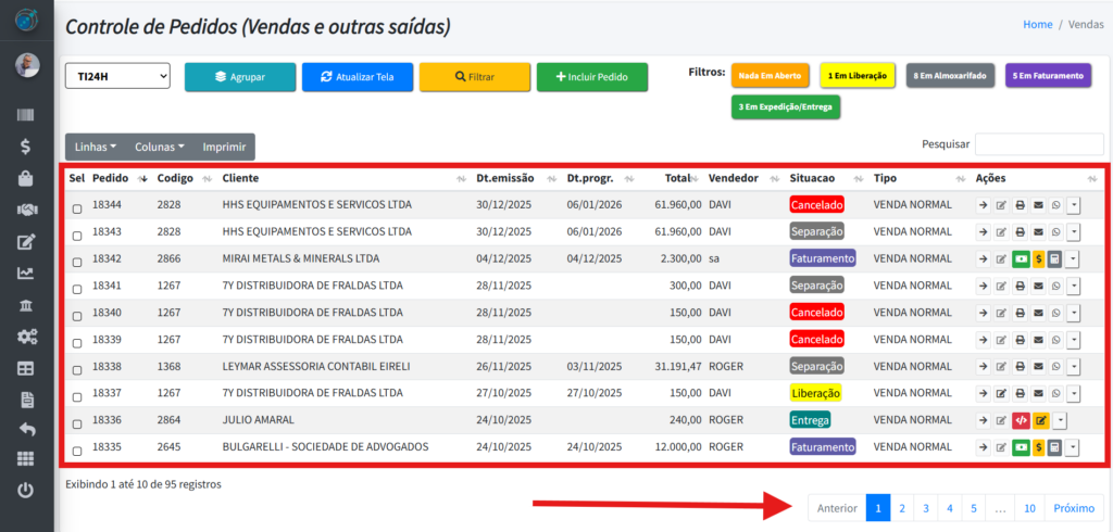 Após clicar no botão “Aplicar Filtro“, você será levado para a página de Controle de Pedidos e conseguirá ver todos os pedidos pelo filtro selecionado. Caso sejam muitos pedidos, não se esqueça de verificar as outras páginas para verifica-los.