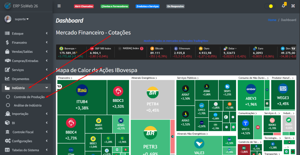 Para acessar a parte de Controle de Produção, na aba lateral vá em “Indústria” -> “Controle de produção“.