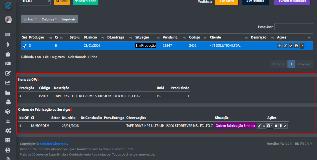 Ao clicar no botão “Iniciar OP“, o seu pedido irá ser levado para a área de Produção, clique no botão “Em Produção”.