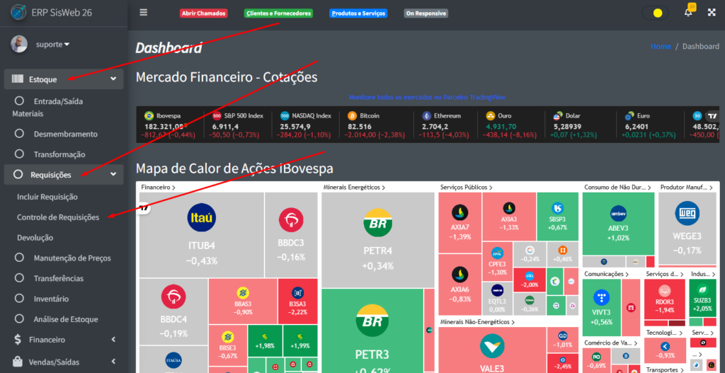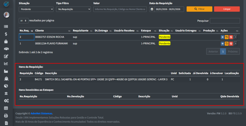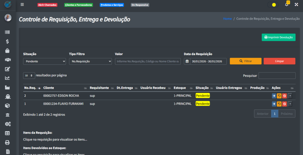 Se você clicar em qualquer requisição, uma tabela com os itens dela irão aparecer na parte de baixo do sistema: