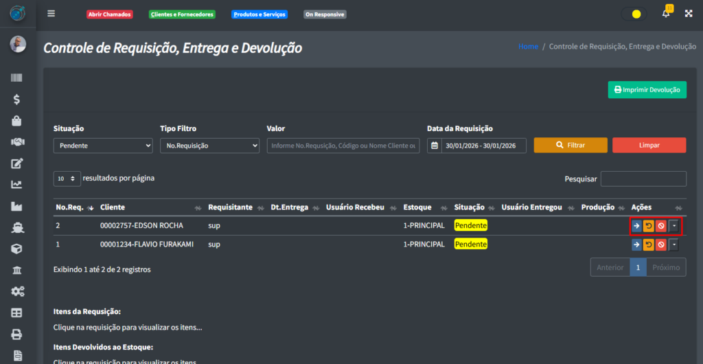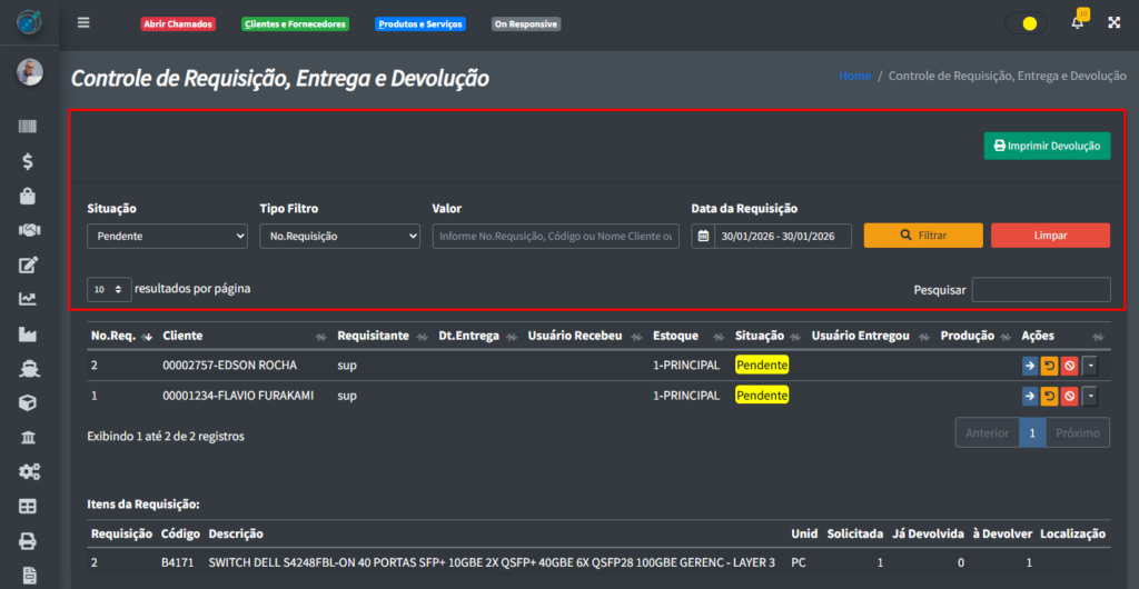 Já o botão “Filtrar“, filtra todas as requisições que tem a mesma informação que foi preenchida nos campos do lado esquerdo do botão.