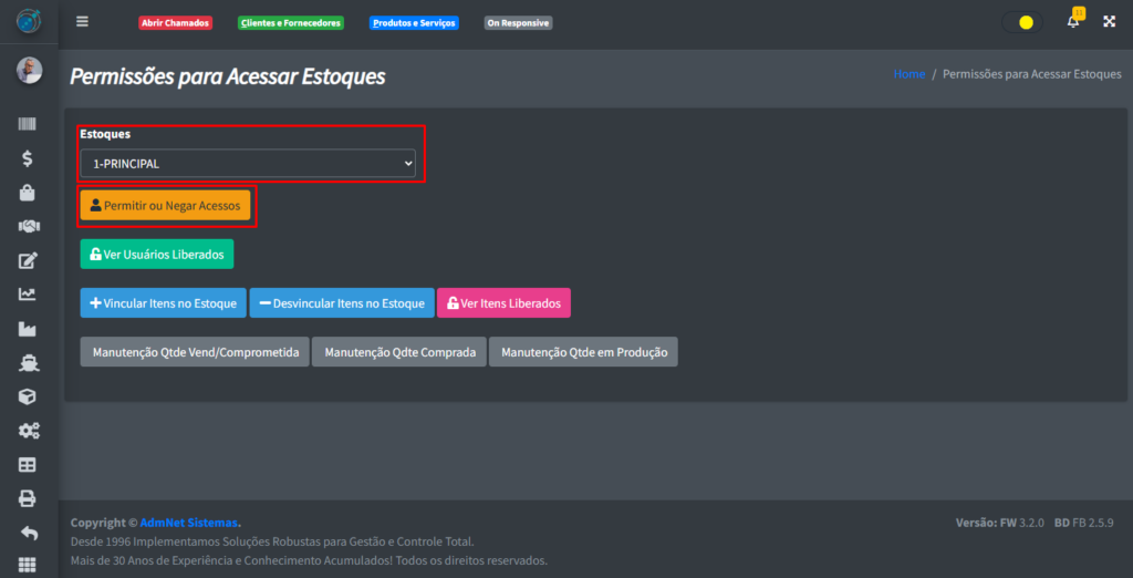 Voltando a tela de Permissões para Acessar o Estoque, restam falar sobre os botões cinzas, cada um deles tem uma função específica: