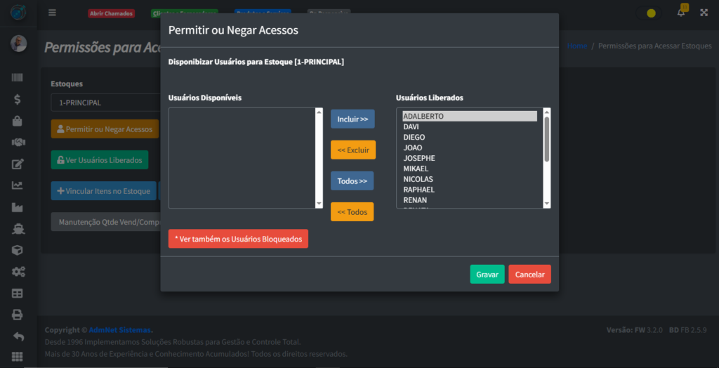 - Cancelar: Cancela todos os usuários que terão acesso ao estoque.