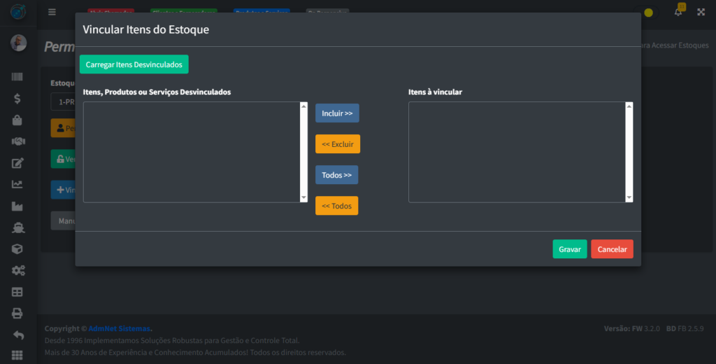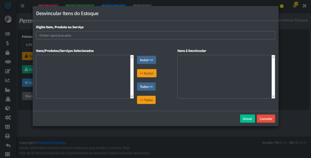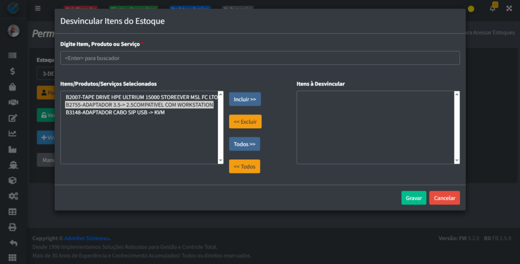 Ao voltar a tela de Permissões para Acessar o Estoque e clicar no botão “– Desvincular Itens no Estoque“, outra tela aparecerá para você: