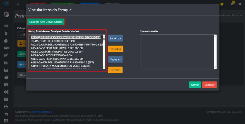 O botão “Carregar itens Desvinculados” carrega todos os itens que não estão vinculados ao estoque selecionado e aparecerão na parte de Itens, Produtos ou Serviços Desvinculados.
