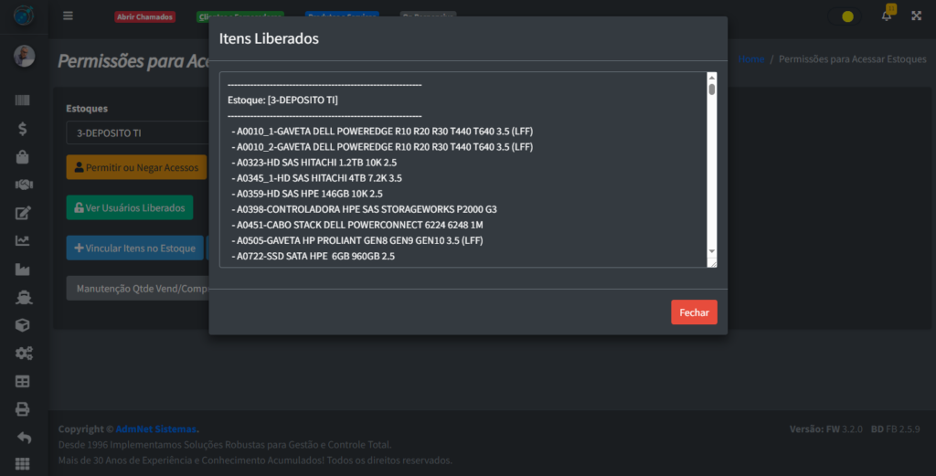 Retornando a tela Permissões para Acessar o Estoque, o botão rosa cria um pequeno relatório de todos os itens que estão liberados no estoque selecionado.