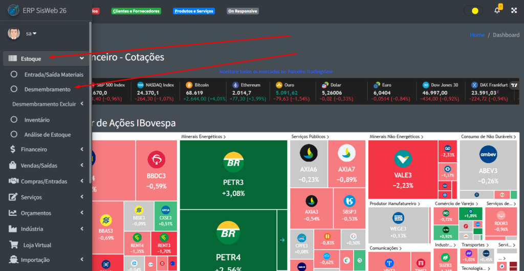 Para poder fazer um novo desmembramento, vá na aba lateral do sistema e clique em “Estoque” -> “Desmembramento”.