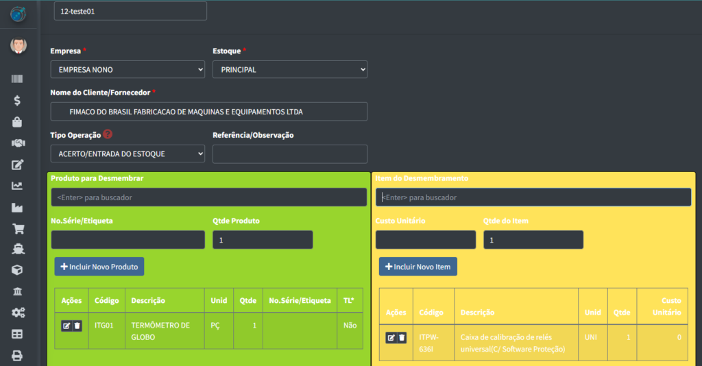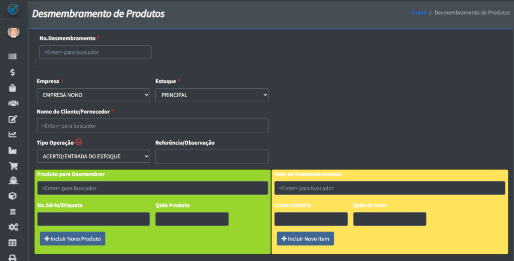 Preencha todos os campos necessário para poder fazer o desmembramento do seu produto.