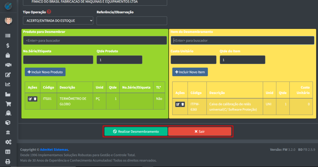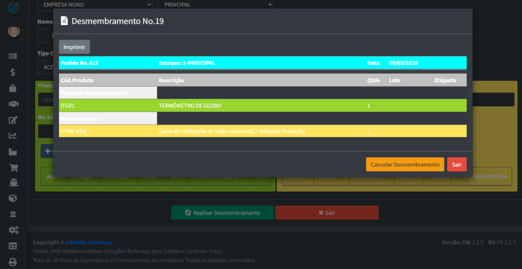 - Imprimir: Gera um relatório do desmembramento feito para a impressão;