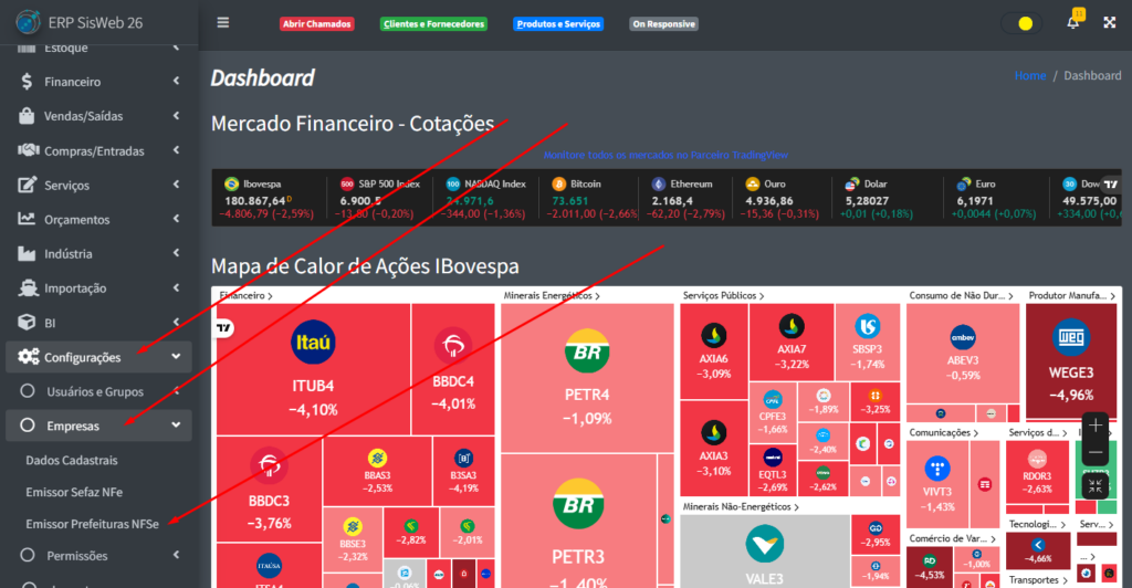 Para acessar a parte de Emissão de NFSe, na aba lateral do sistema, clique em “Configurações” -> “Empresas” -> “Emissor Prefeituras NFSe“.