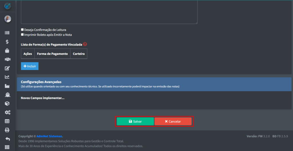 Após preencher todos os campos, vá até o final da página e clique no botão “Salvar” para gravar todas as informações no sistema ou clique em “Cancelar” para cancelar o envio de todas as informações.