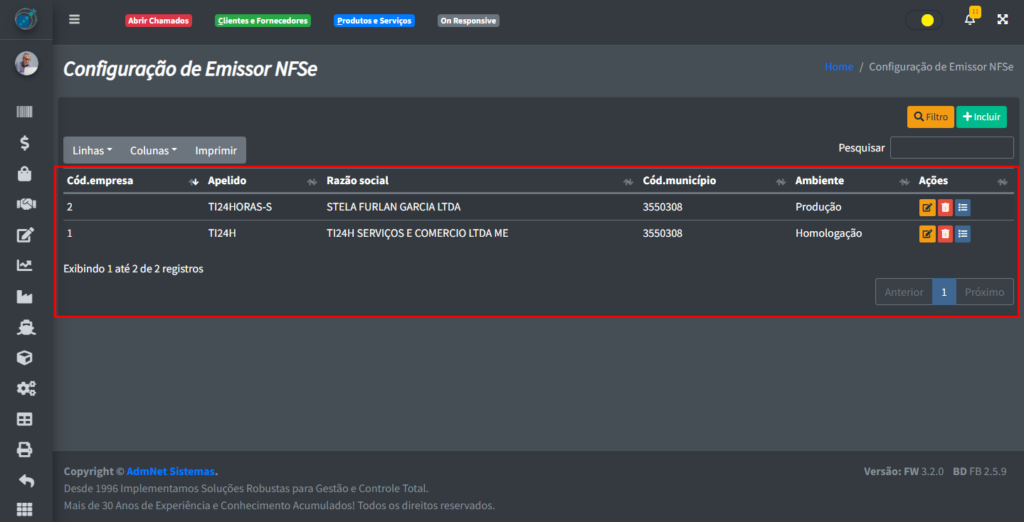 - Excluir Registro: Deleta os dados da emissão da nfse do sistema;