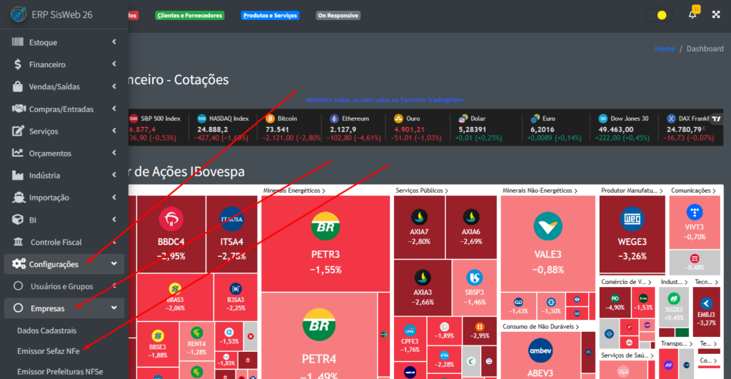 Para acessar a parte de Emissão de NFe, na aba lateral do sistema, clique em “Configurações” -> “Empresas” -> “Emissor Sefaz NFe“.