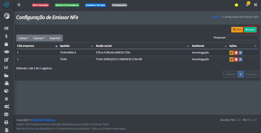 Para poder criar um novo emissor de NFe, clique no botão “+ Incluir“: