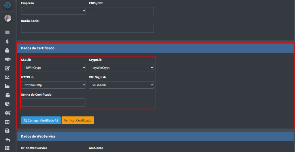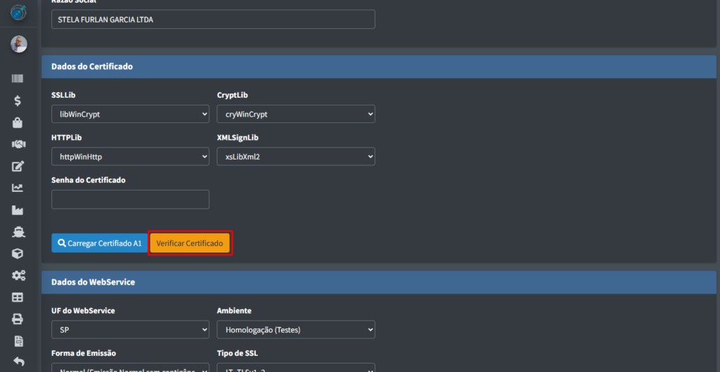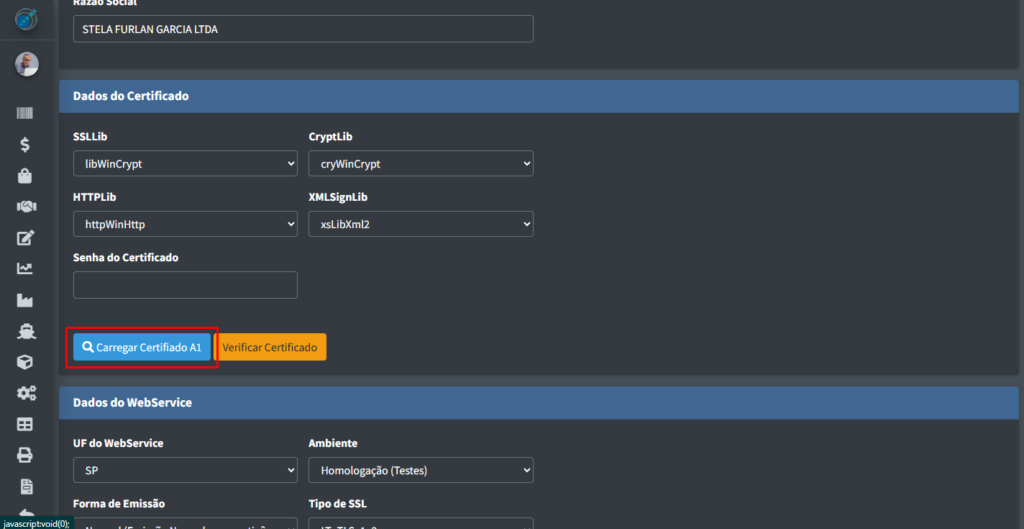 OBS: Não se esqueça de colocar a senha do certificado no campo de “Senha do Certificado” na parte acima do botão “Carregar Certificado A1“.