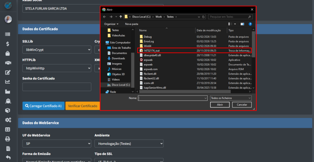 Ápos clicar no botão, irá aparecer uma tela onde você terá que procurar o certificado na pasta do seu computador: