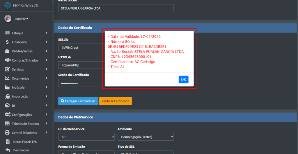 Caso o seu certificado tenha carregado corretamente, o sistema irá mostrar uma notificação para você mostrando algumas das informações sobre o certificado: