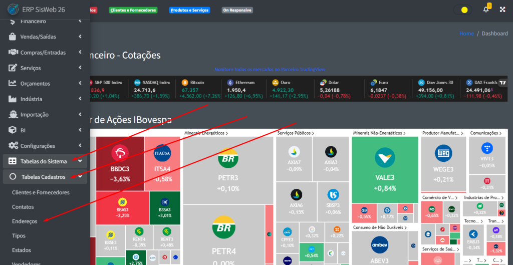 Para poder acessar a parte de cadastro de endereços, na aba lateral do site, clique em “Tabelas de Sistema” -> “Tabelas Cadastros” -> “Endereços“.