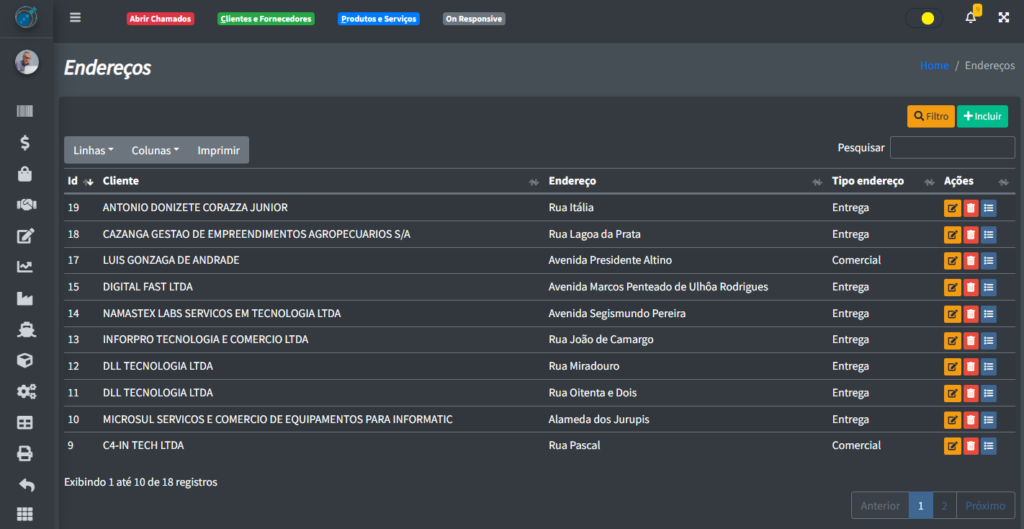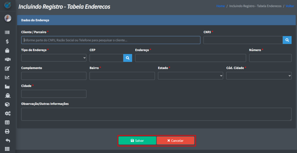 pós clicar em “+ Incluir“, você verá uma tela onde poderá cadastrar os endereços: