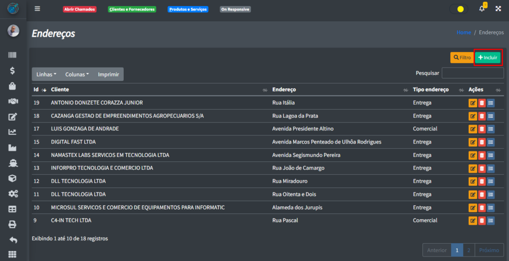 Para pode incluir um novo endereço, clique no botão “+ Incluir“: