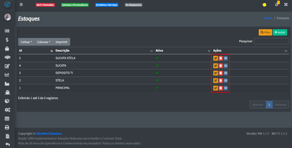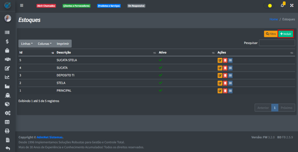 Para pode incluir um novo estoque, clique no botão “+ Incluir“: