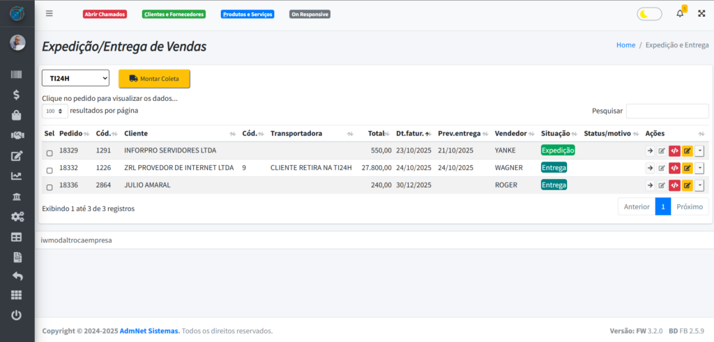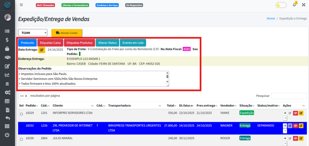 - Evento em Lote: Registra o evento nos pedidos selecionados;