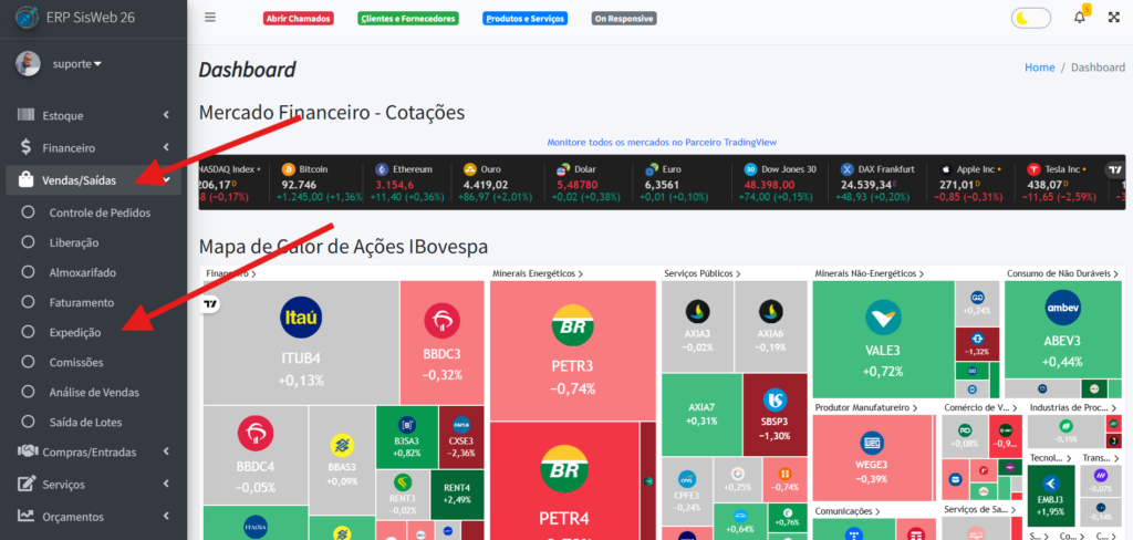 Para ter acesso aos pedidos em Expedição, na aba lateral do sistema, vá para “Vendas/Saídas” -> “Expedição“.