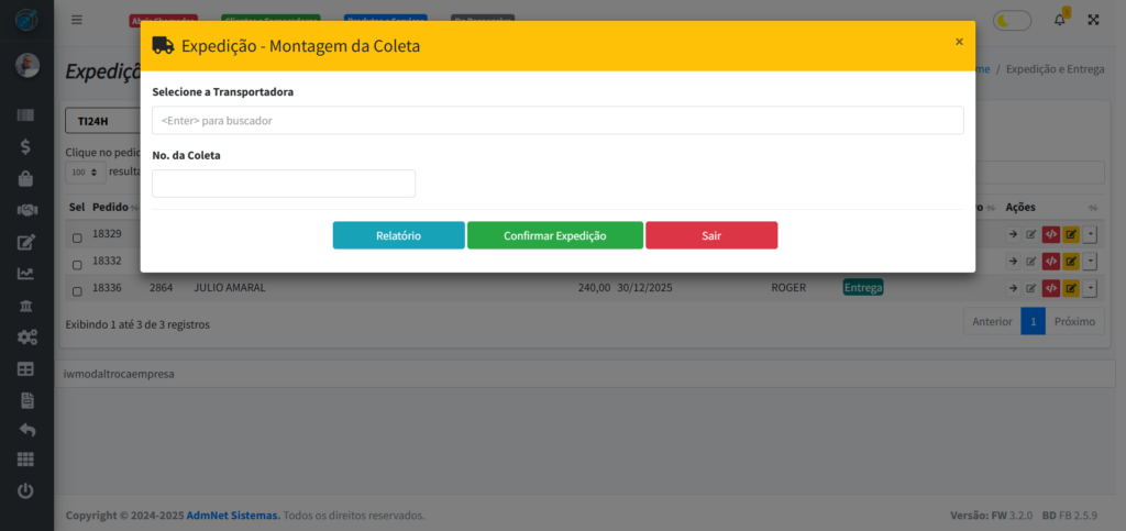 Indique a transportadora que está no mesmo pedido indicado e o Número da coleta. Clique em “Relatório” para ver o relatório do pedido, “Confirmar Expedição” para prosseguir e “Sair” para sair da tela.