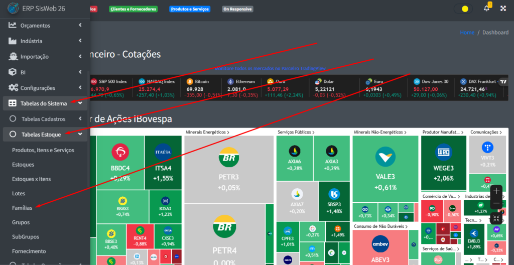 Para poder acessar a parte de família, na aba lateral do site, clique em “Tabelas de Sistema” -> “Tabelas Estoques” -> “Família“.