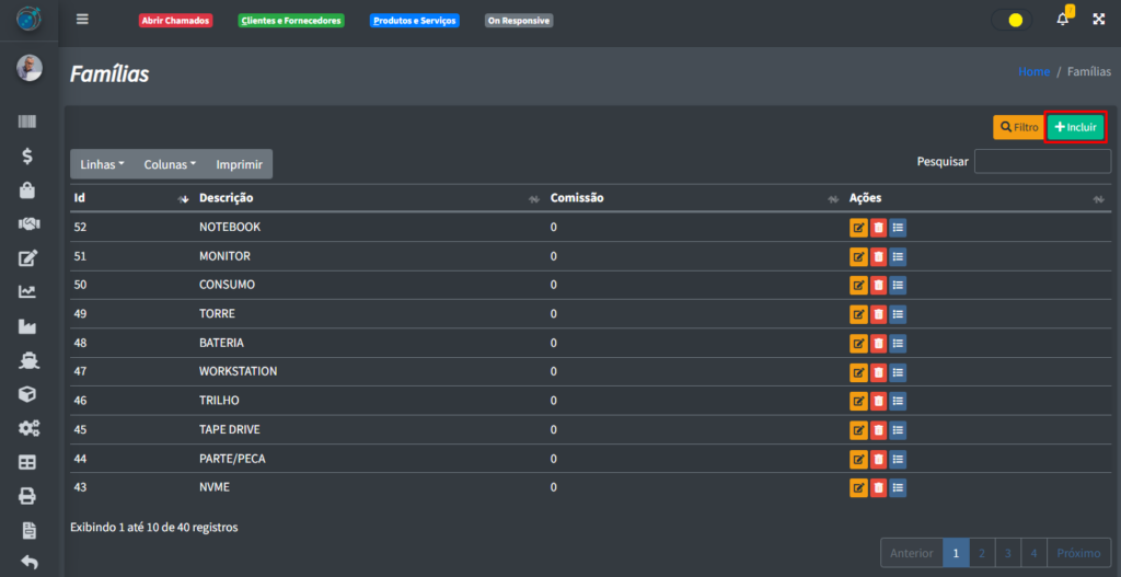 Para pode incluir uma nova família, clique no botão “+ Incluir“: