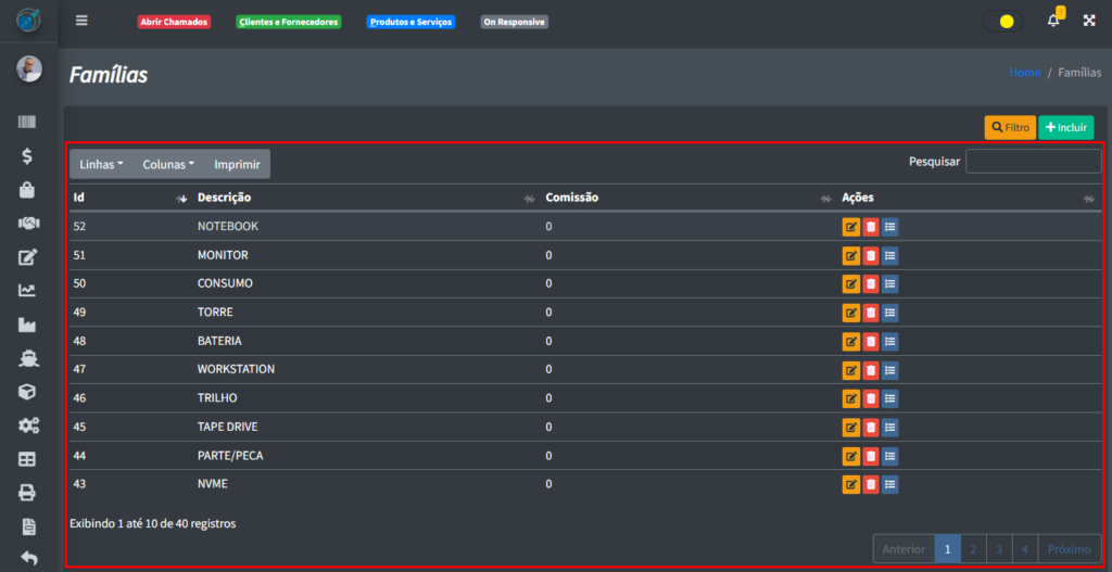 Ao clicar no botão de “Salvar“, você vai voltar para a tela anterior de maneira automática e poderá ver o sua nova família na tabela.
