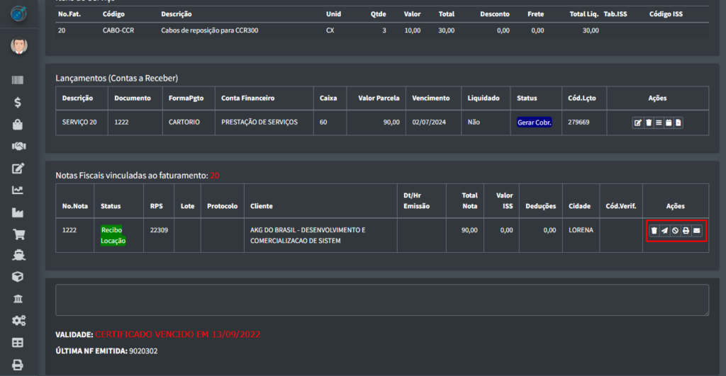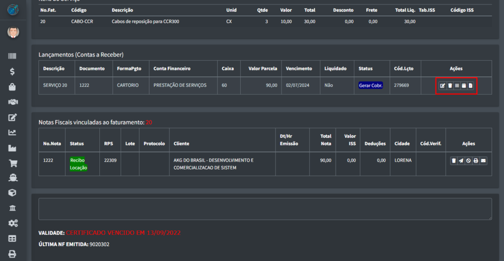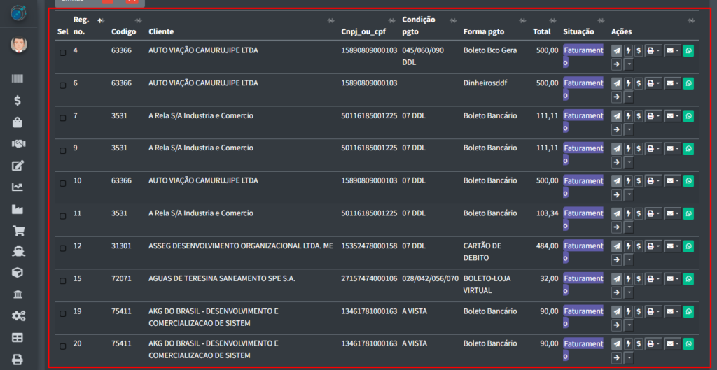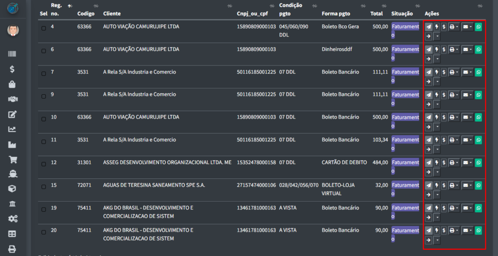 Voltando para a a tabela principal, onde se pode verificar os faturamentos, há também alguns botões vinculados aos registros na tabela: