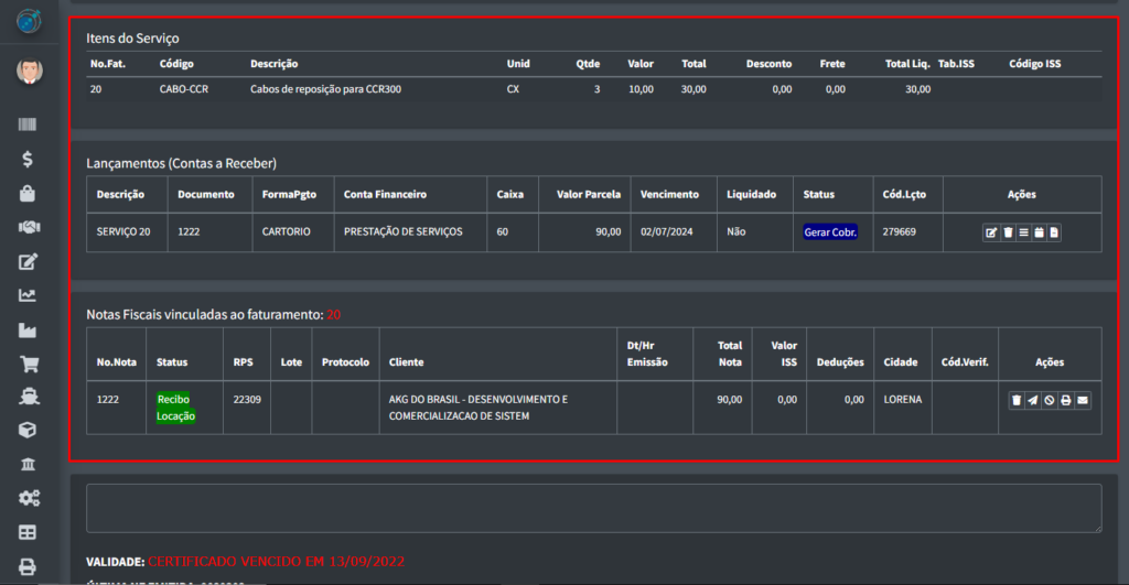 Ao selecionar um faturamento, vai aparecer algumas informações sobre registro no fim da tela, como: os itens do serviços, os lançamentos(contas a receber) e as notas fiscais vinculadas ao faturamento de serviço.